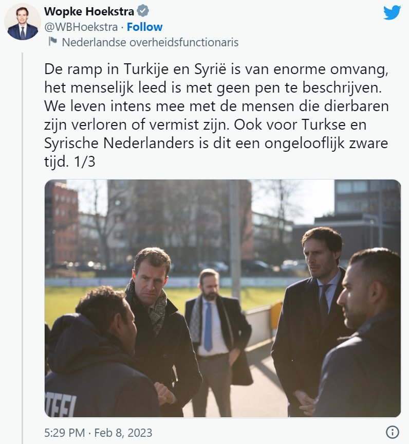 Minister Liesje Schreinemacher voor Buitenlandse Handel en Ontwikkelingssamenwerking (BHOS) stelt 10 miljoen euro beschikbaar voor noodhulp aan de slachtoffers van de aardbevingen in het noordwesten van Syrië. Daarvan wordt 7 miljoen euro via fondsen van de Verenigde Naties gebruikt om hen te voorzien van tenten, dekens, voedsel en water. De overige 3 miljoen euro wordt besteed via Nederlandse hulporganisaties. Lees het hele nieuwsbericht.