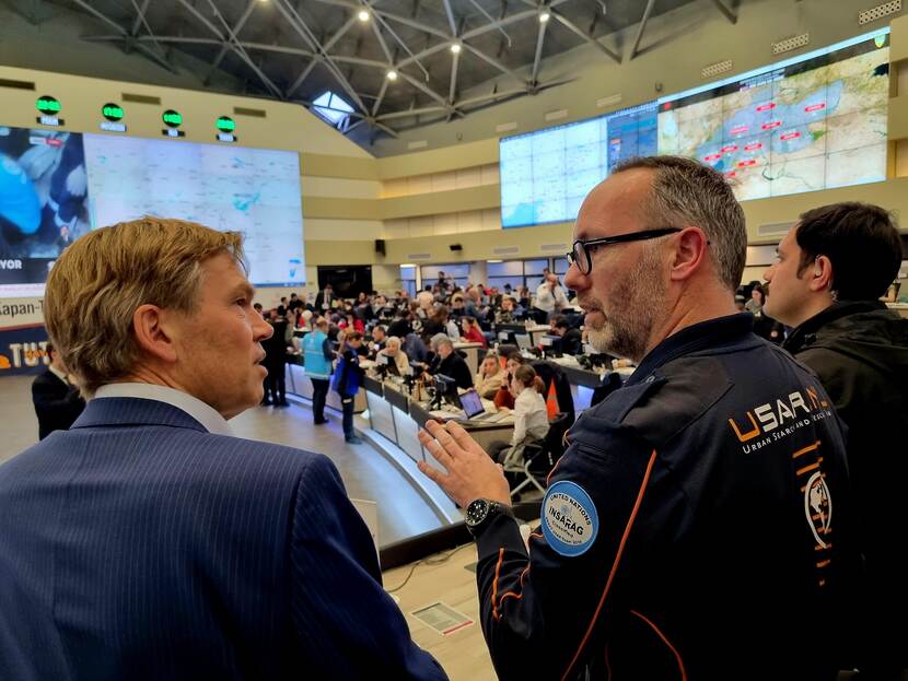 Eerder op de dag sprak Wijnands ook met Job Kramer, teamleider bij USAR in Hatay. Kramer vertelde dat het hele intensieve dagen zijn, maar dat elke redding het team steeds weer een enorme boost geeft. De ambassadeur sprak zijn grote waardering en dank uit voor hun inzet: ‘Behalve dat jullie zelf fantastisch werk doen, coördineren jullie ook nog eens het werk van al die andere USAR-teams. Wat jullie doen, is echt bijzonder. De Nederlandse expertise op het gebied van search and rescue en internationale coördinatie is hier letterlijk van levensbelang.’