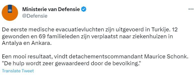 Een Nederlands transportvliegtuig zal in Turkije gewonden uit het rampgebied in Turkije halen. Per vlucht kunnen 70 mensen worden vervoerd. Het ministerie van Defensie en Buitenlandse Zaken werken samen bij deze inzet.