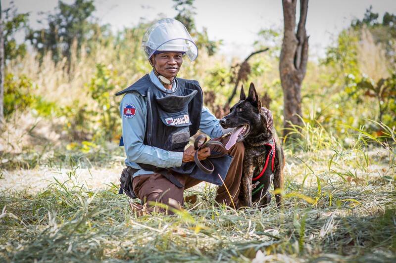 Een ander voorbeeld is een nieuwe activiteit van HI waarbij honden worden ingezet om landmijnen op te sporen in Senegal. De honden zijn getraind om mijnen te ruiken en lopen in rechte lijnen over een stuk land. Aan de hand van de verzamelde GPS-data wordt een digitale kaart getekend die laat zien waar de mijnen mogelijk liggen. Met behulp van de honden kan er per dag 1500m² land worden onderzocht. Ter vergelijking: een mens kan met een metaaldetector zo’n 40m² per dag onderzoeken. Dat is enorme winst!’