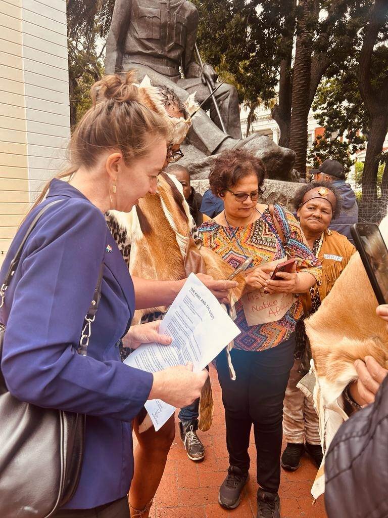 Maar het liep iets anders, vertelt Jessica. ‘Nog voor de delegatie de Slave Lodge betrad trof men een protestgroep, bestaande uit leden van de Khoisan-gemeenschap.’ De Khoisan is een gecombineerde gemeenschap van verschillende groepen oorspronkelijke bewoners van Zuid-Afrika, zoals de KhoeKhoe en de San. Zij ondervonden grote nadelen van het koloniale verleden van Nederland, zoals het verlies van land.