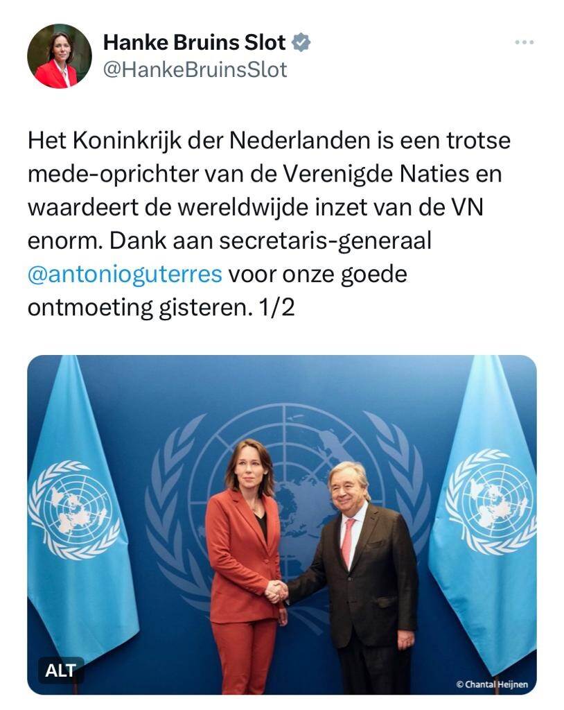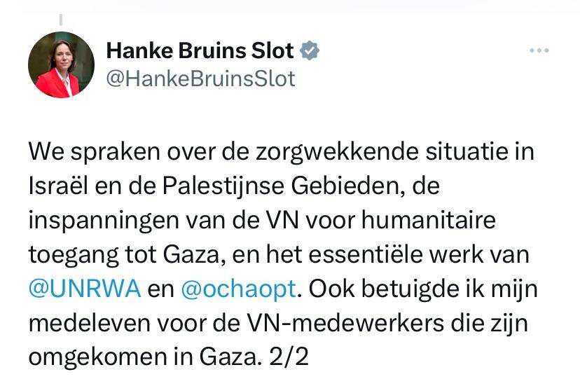 Minister Hanke Bruins Slot had gisteren een ontmoeting met secretaris-generaal Antonio Guterres van de Verenigde Naties. Ze spraken over de situatie in Israel en de Palestijnse Gebieden. Dat schrijft de Nederlandse minister van Buitenlandse Zaken op X. Bruins Slot betuigde haar medeleven voor de omgekomen VN-medewerkers in Gaza.