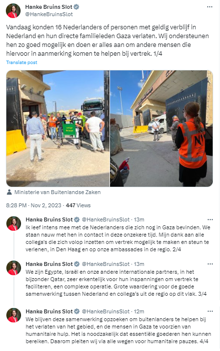 Tegelijkertijd zijn collega’s in binnen- en buitenland elke dag bezig om ervoor te zorgen dat Nederlanders die nog vastzitten in Gaza ook zo spoedig mogelijk het gebied kunnen verlaten. Daar werken we in samenwerking met onder andere onze ambassades in de regio, Defensie en internationale partners hard aan.'