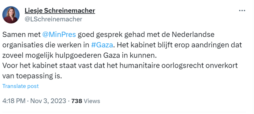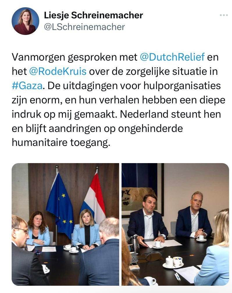 Minister Liesje Schreinemacher (Ontwikkelingssamenwerking) en minister-president Mark Rutte spraken vandaag met de Nederlandse hulporganisaties in Gaza. 'Het kabinet blijft erop aandringen dat zoveel mogelijk hulpgoederen Gaza in kunnen', schrijft de minister op X.