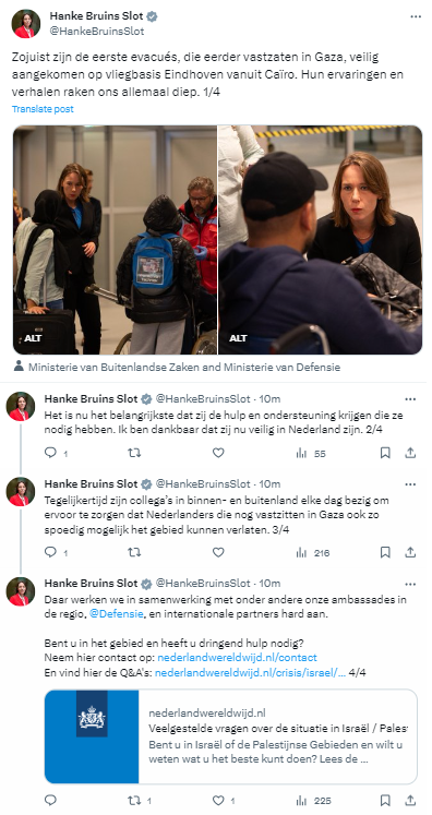 Op X deelde de minister: 'Zojuist zijn de eerste evacués, die eerder vastzaten in Gaza, veilig aangekomen op vliegbasis Eindhoven vanuit Caïro. Hun ervaringen en verhalen raken ons allemaal diep. Het is nu het belangrijkste dat zij de hulp en ondersteuning krijgen die ze nodig hebben. Ik ben dankbaar dat zij nu veilig in Nederland zijn.