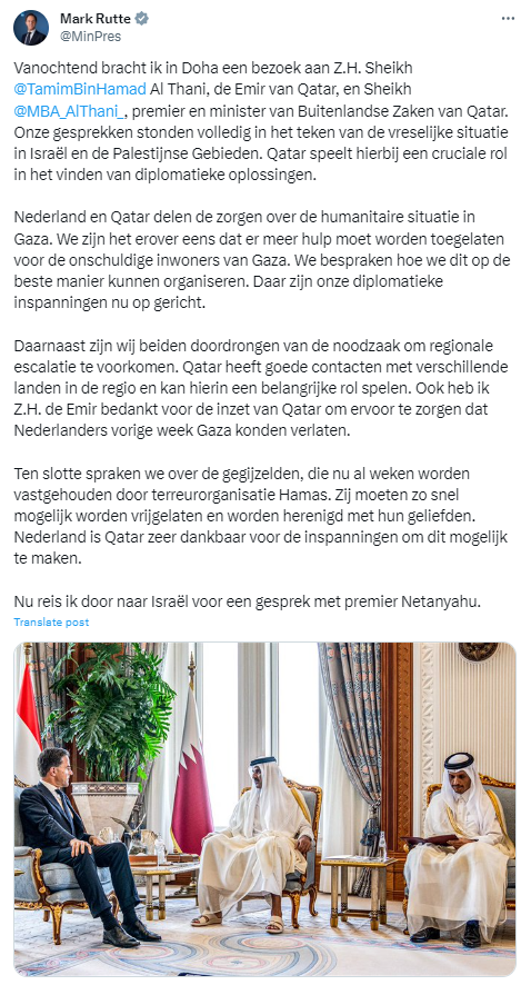 Minister-president Mark Rutte meldt op X: 'Vanochtend bracht ik in Doha een bezoek aan Z.H. Tamim bin Hamad Al Thani, de Emir van Qatar, en Mohammed Bin Abdulrahman al-Thani, premier en minister van Buitenlandse Zaken van Qatar. Onze gesprekken stonden volledig in het teken van de vreselijke situatie in Israël en de Palestijnse Gebieden. Qatar speelt hierbij een cruciale rol in het vinden van diplomatieke oplossingen.