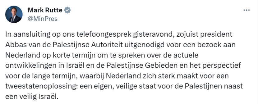Minister-president Mark Rutte meldt op X: 'In aansluiting op ons telefoongesprek gisteravond, zojuist president Abbas van de Palestijnse Autoriteit uitgenodigd voor een bezoek aan Nederland op korte termijn om te spreken over de actuele ontwikkelingen in Israël en de Palestijnse Gebieden en het perspectief voor de lange termijn, waarbij Nederland zich sterk maakt voor een tweestatenoplossing: een eigen, veilige staat voor de Palestijnen naast een veilig Israël.'