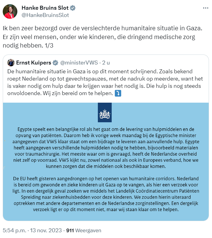 Nederland roept op tot humanitaire pauzes en het creëren van een humanitaire corridor. Zodat voedsel, water, brandstof en medicijnen naar Gaza kunnen worden ingevoerd, en zodat mensen Gaza uit kunnen. Onze diplomatieke inzet blijft daarop gericht.