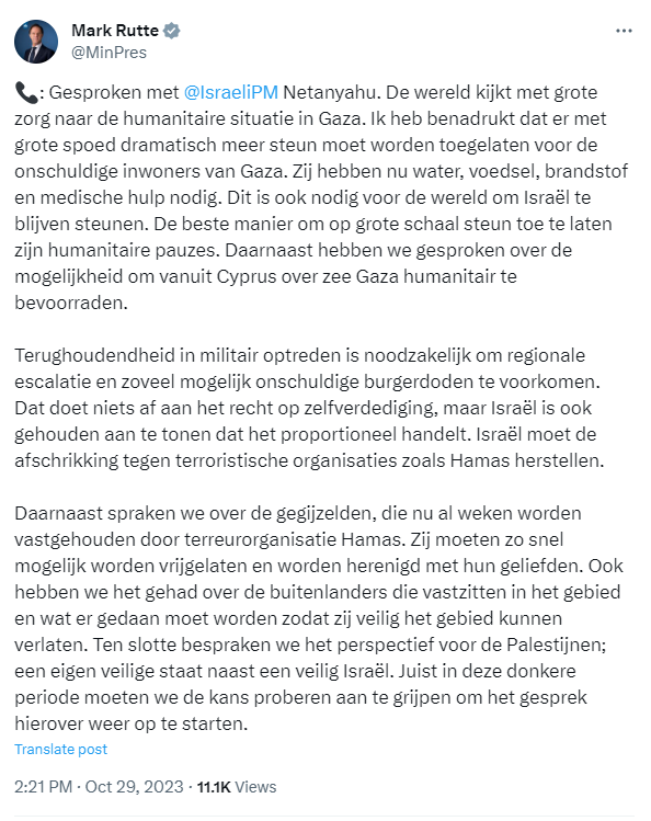 Minister-president Mark Rutte meldt op X: 'Gesproken met mijn Britse collega Rishi Sunak over de verontrustende situatie in het Midden-Oosten. Er is urgent meer nodig op het gebied van humanitaire hulp voor de onschuldige inwoners van Gaza. Tergelijkertijd steunen wij Israël om afschrikking tegen terreurgroepen te herstellen.