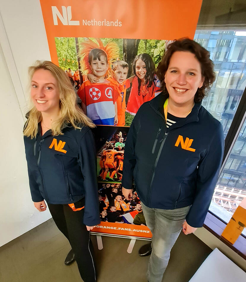 Meike: ‘Ook in Australië staat ons team klaar bij de fanzones. Met onze Koningsblauwe sweaters en shirts met oranje NL logo’s zijn we goed zichtbaar tussen alle Oranjefans!’