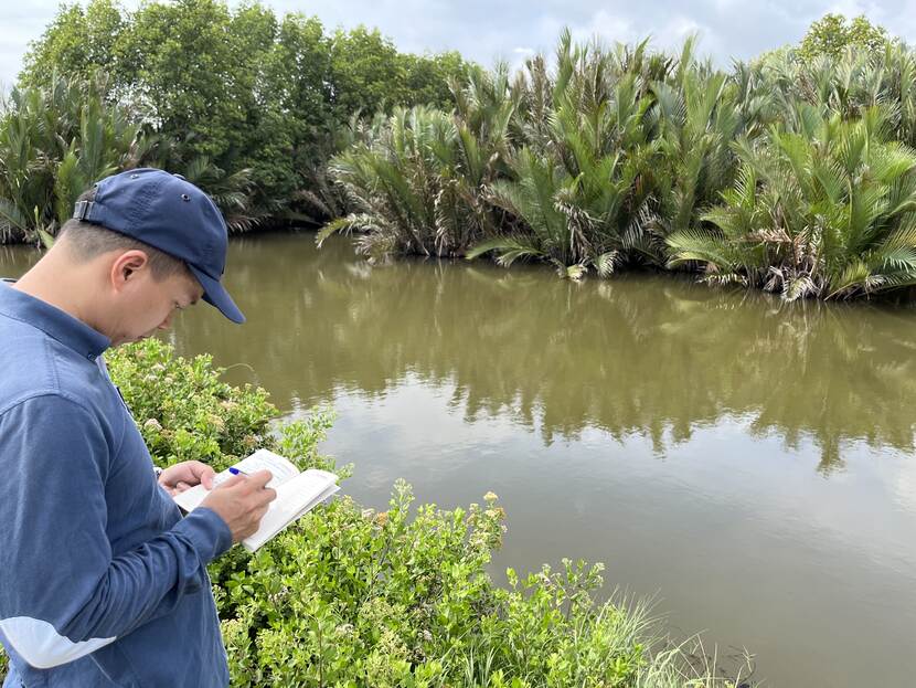 Het Mangrove Living Lab onderzoekt onder welke omstandigheden nieuw aangeplante bomen gedijen. Wetenschappers en studenten vanuit allerlei disciplines werken hiervoor samen. ‘Ingenieurs en ecologen, maar ook sociologen, kunstenaars en economen,’ vertelt assistent-professor Waterbouw Le Hai Trung. ‘De mangrove in al zijn aspecten moet aan bod komen.’
