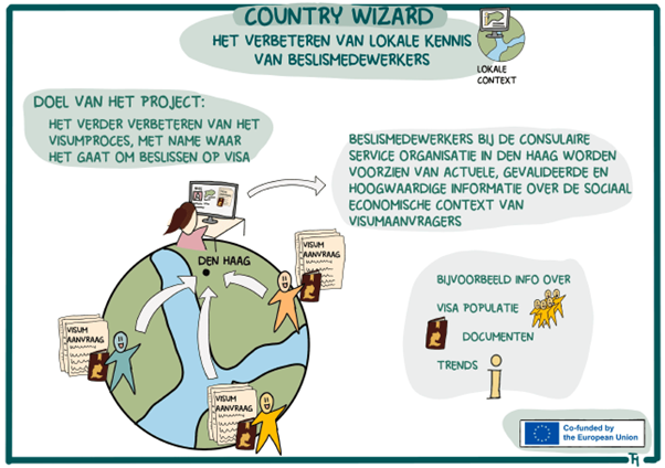 De Country Wizard (CW) is een kennisbank met actuele informatie over landen waar visumaanvragers vandaan komen. Denk aan de sociaal-economische situatie, belangrijke economische sectoren en andere relevante gegevens. Met deze kennisbank beschikken de beslismedewerkers allemaal over dezelfde feitelijke achtergrondkennis en kunnen zij een aanvraag beter plaatsen in de context van het land van herkomst Dit maakt het besluitvormingsproces uniformer, objectiever en beter onderbouwd.