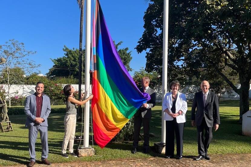 De Nederlandse ambassades zijn ook zichtbaar als LHBTIQ+-bondgenoot tijdens de Pride Month en op IDAHOBIT. Tijdens de Pride Month in Brazilië ging de ambassadeur vorig jaar op de ambassade in gesprek met leden van het Braziliaanse parlement. Floot: Op IDAHOBIT zelf houden we een vlaghijsingsceremonie met de Braziliaanse overheid, ngo’s en andere (EU)-landen. Dat klinkt niet heel spectaculair, maar het draagt bij aan zichtbaarheid en waar Nederland voor staat. LHBTIQ+-mensen in Brazilië weten dat zij Nederland aan hun zijde vinden.’