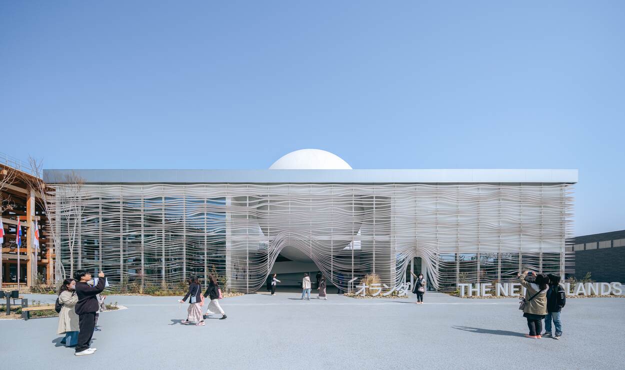 Het Nederlandse paviljoen is ontworpen en gerealiseerd door het Nederlands-Japanse consortium AND BV, bestaande uit architectenbureau RAU, ingenieursbureau DGMR, experience design studio Tellart en het Japanse aannemersbedrijf Asanuma. Het paviljoen heeft de vorm van een rechthoekig gebouw met centraal een lichtgevende bol – een indrukwekkend symbool van een “man-made sun”: een schone en onuitputtelijke energiebron op basis van waterkracht. De gevel is bekleed met golvende lamellen die het stromende water verbeelden. Samen vormen ze een lengte van precies 425 meter, als eerbetoon aan 425 jaar handelsrelaties tussen Nederland en Japan. Het paviljoen is tevens een krachtig voorbeeld van circulair bouwen. Alle gebruikte materialen zijn geregistreerd in Madaster, het digitale materialenpaspoort voor circulaire bouw en infrastructuur. Zo blijft exact inzichtelijk welke materialen zijn toegepast en gaan er geen waardevolle grondstoffen verloren.