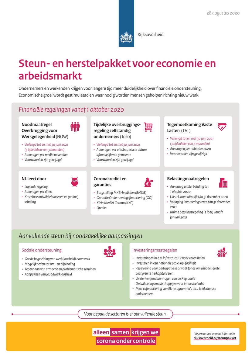 Het kabinet verlengt vanaf 1 oktober 2020 diverse lopende steunmaatregelen. De voorwaarden daarvan worden aangepast, zodat ze meer zijn gericht op de langere termijn. Het kabinet neemt bovendien nieuwe maatregelen om bedrijven te stimuleren om meer te investeren in economische groei. Ook zet het kabinet extra middelen in om mensen via scholing en begeleiding te helpen bij het vinden van nieuw werk.