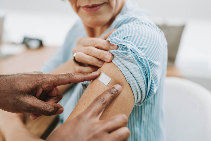 Verpleegkundige doet pleister op arm van vrouw na coronavaccinatie
