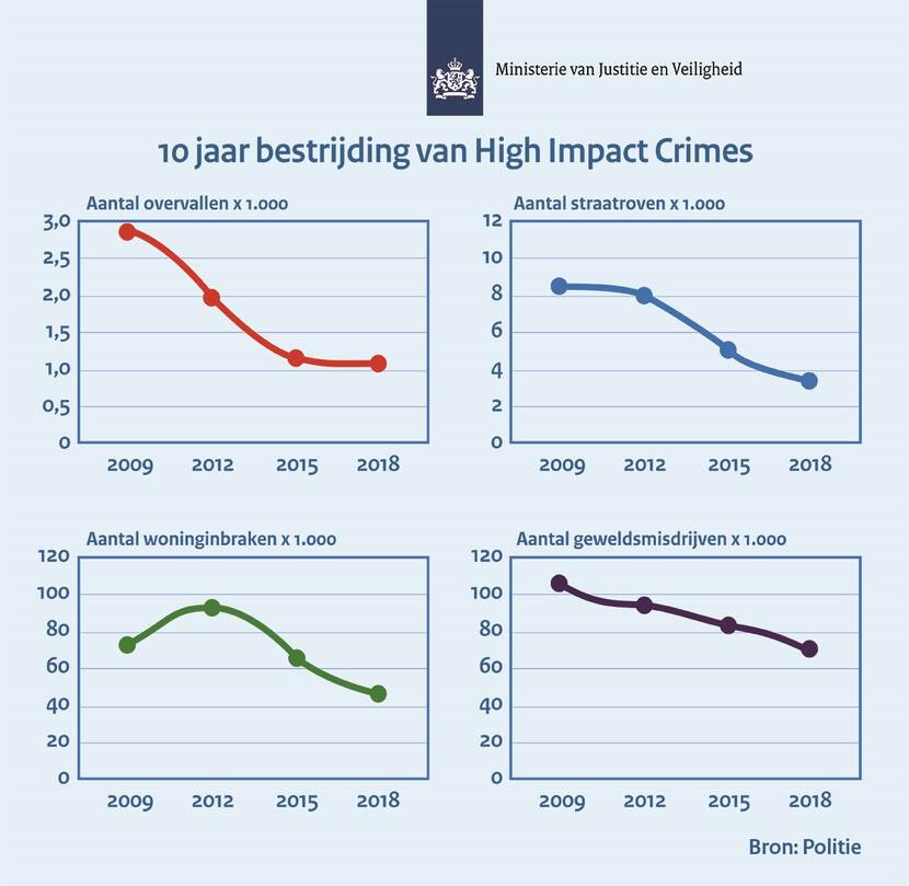 Het afgelopen decennium zijn overvallen, straatroven, woninginbraken en geweld stevig aangepakt. Minister Grapperhaus van Justitie en Veiligheid spreekt vandaag op het congres '10 jaar bestrijding van high impact crimes' om terug te blikken op de succesvolle aanpak; zo is het aantal overvallen ruimschoots gehalveerd.
