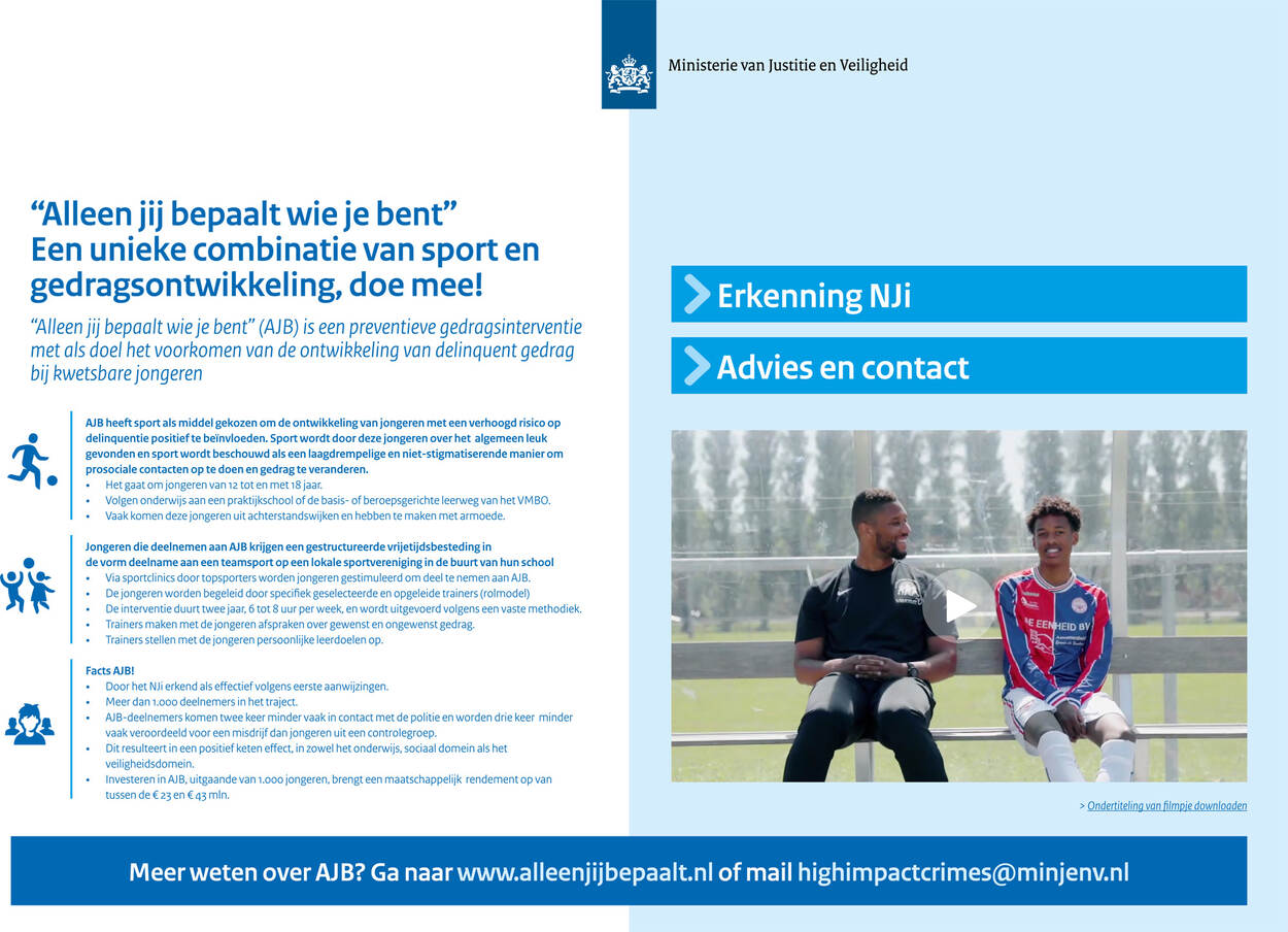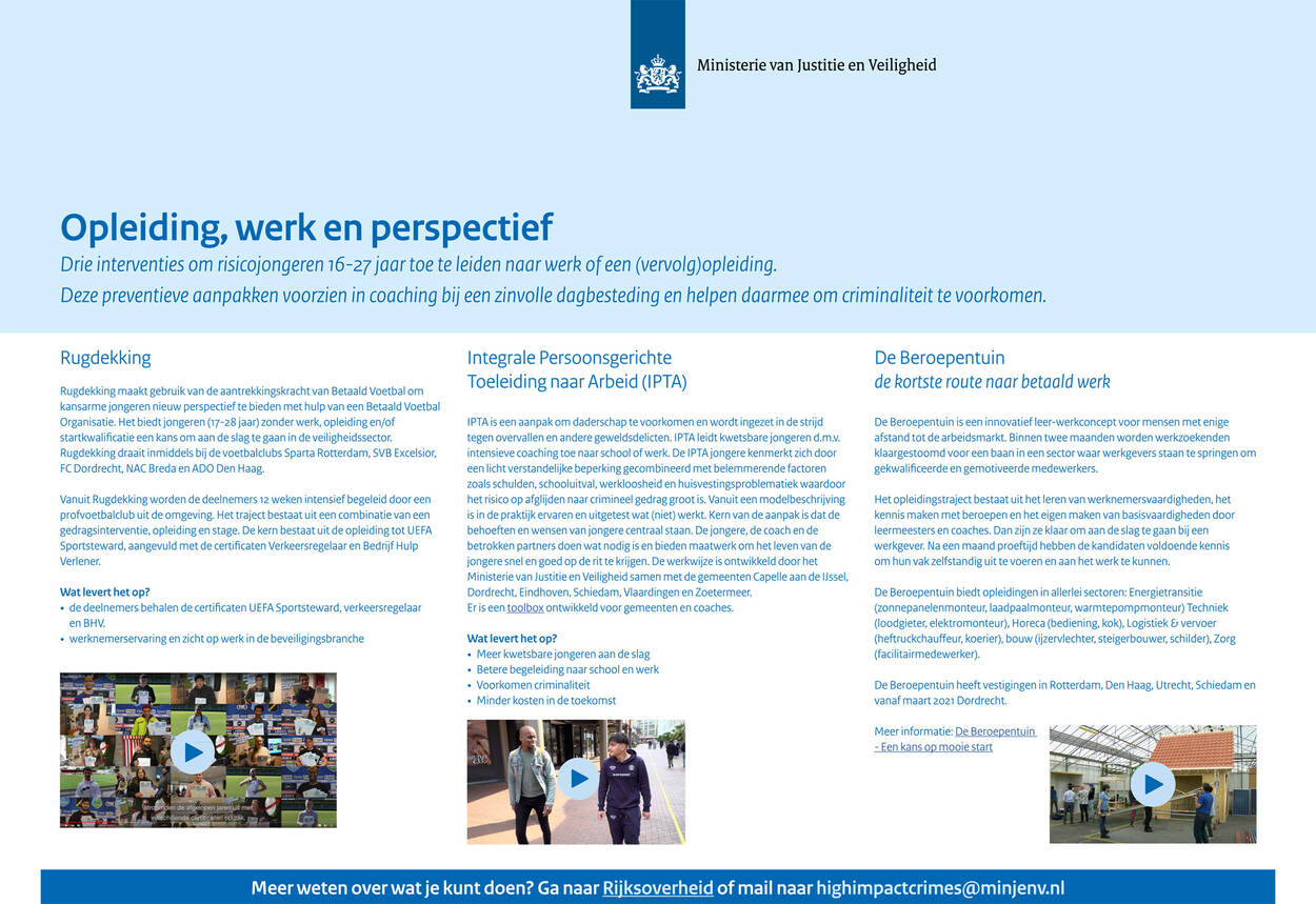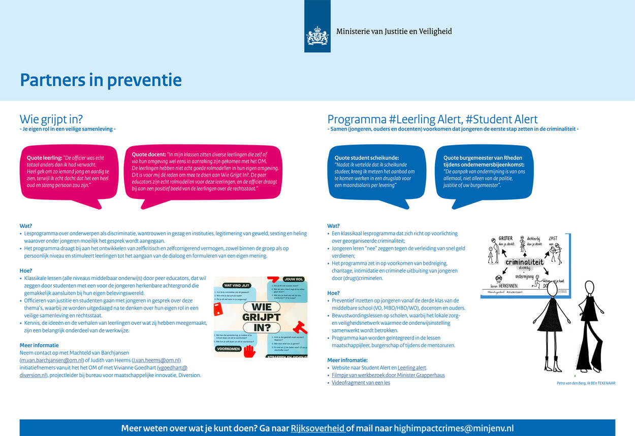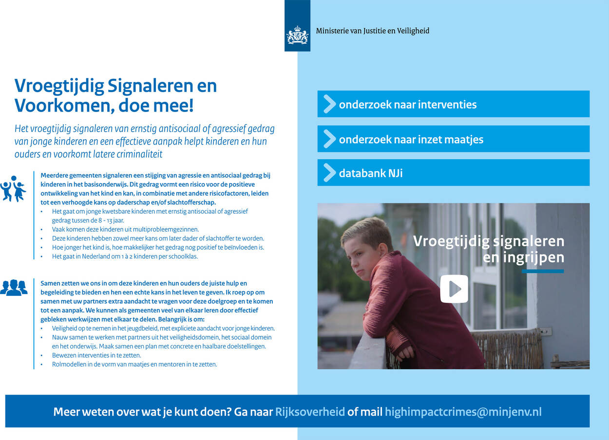 Om te voorkomen dat kwetsbare groepen, zoals jongeren, met politie en justitie in aanraking komen, heeft justitie een aantal factsheet opgesteld. Deze zijn bedoeld voor professionals in gemeenten die zich, vanuit veiligheid, onderwijs of sociaal domein, bezighouden met kwetsbare kinderen en jongeren. Deze factsheets bieden informatie over interventies en aanpakken voor verschillende leeftijden.