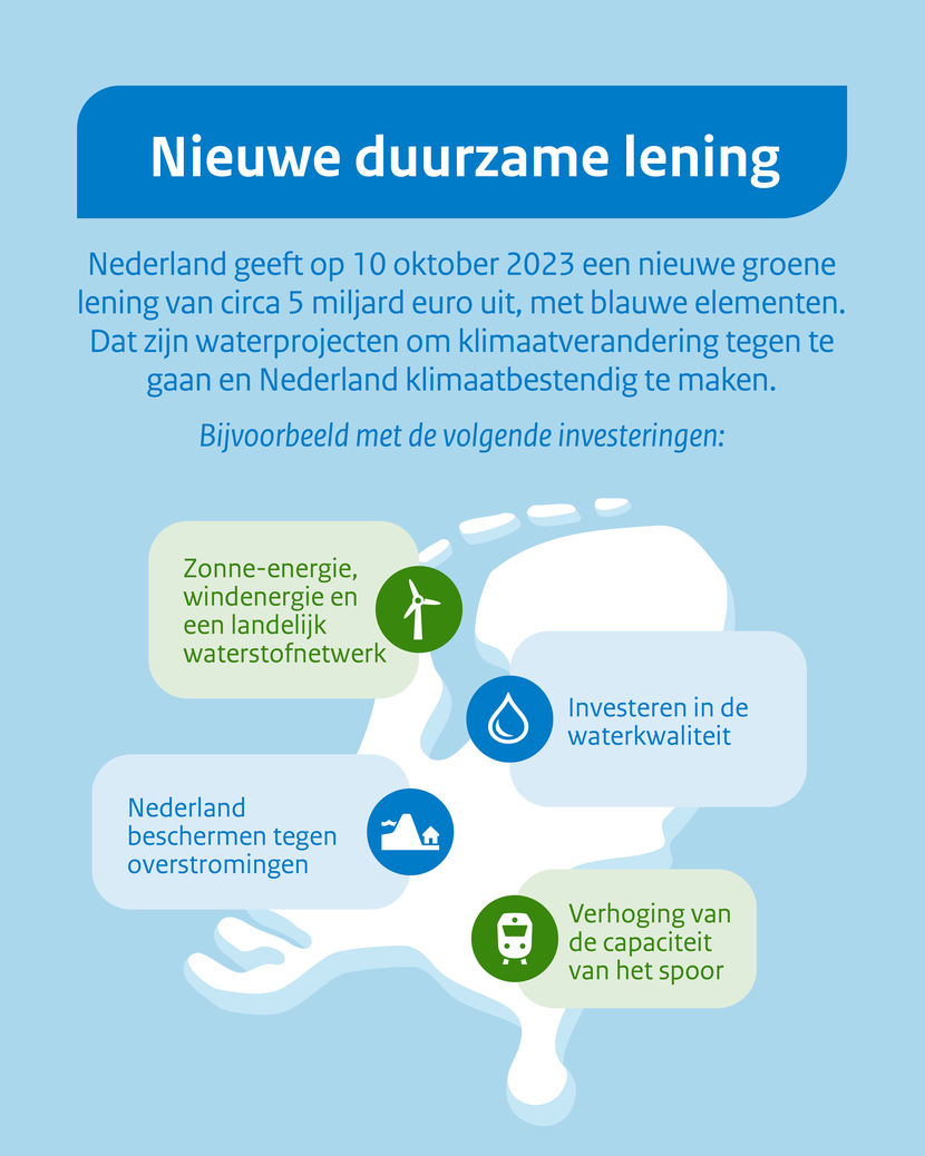 Op 8 september 2023 is het geactualiseerde groene obligatieraamwerk gepubliceerd, met speciale aandacht voor waterinvesteringen zoals het Deltafonds ("blauwe uitgaven"). De uitgaven voor deze specifieke investeringen sluiten aan bij de wijzigingen en toevoegingen aan de EU Taxonomie die per 1 januari 2024 van kracht zijn. De nieuwe groene obligatie van 2023 is daarmee de eerste triple-A obligatie waarbij de "blauwe" elementen volledig aansluiten bij de EU Taxonomie.