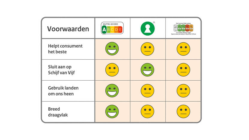 De Rijksoverheid stelde een aantal voorwaarden aan het nieuwe voedselkeuzelogo voor Nederland. Het logo moet vooral te begrijpen zijn. Ook moet het logo voldoende aansluiten op richtlijnen voor goede voeding en bruikbaar zijn voor zoveel mogelijk verschillende producten. Verder houdt het rekening met internationale ontwikkelingen. Op die manier is Nutri-Score ook geschikt voor gebruik in andere Europese landen.
