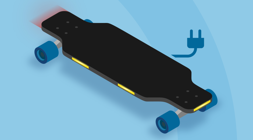 Een skateboard met een elektromotor. Er is geen stuur of zitplaats aanwezig.