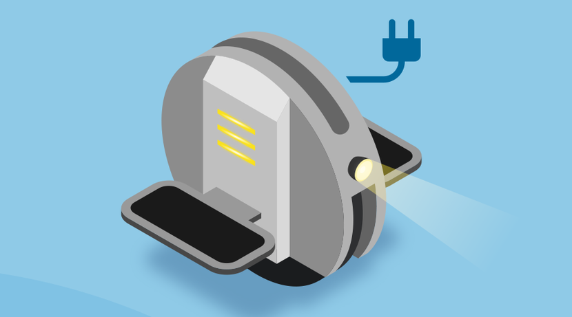 Een elektrische eenwieler met een plank om op te staan. De onewheel gaat door beweging vooruit of achteruit. Er is geen stuur of zitplaats aanwezig.